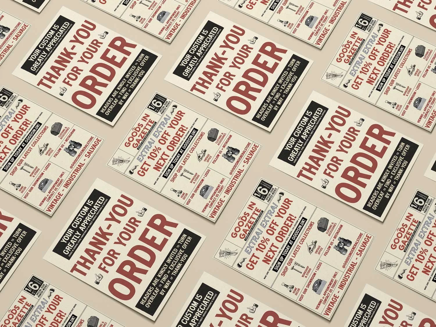 The aim of the flyers was to raise awareness of the business and its wider product range, and thank customers for their purchase. With the business specialising in salvaged vintage goods and homewares, and giving long-forgotten treasures and ephemera a new lease of life, I looked to original print media for inspiration, in particular 1930’s/40’s era newspapers, as they are not only fascinating from a design perspective, but also are synonymous with conveying important messages quickly.