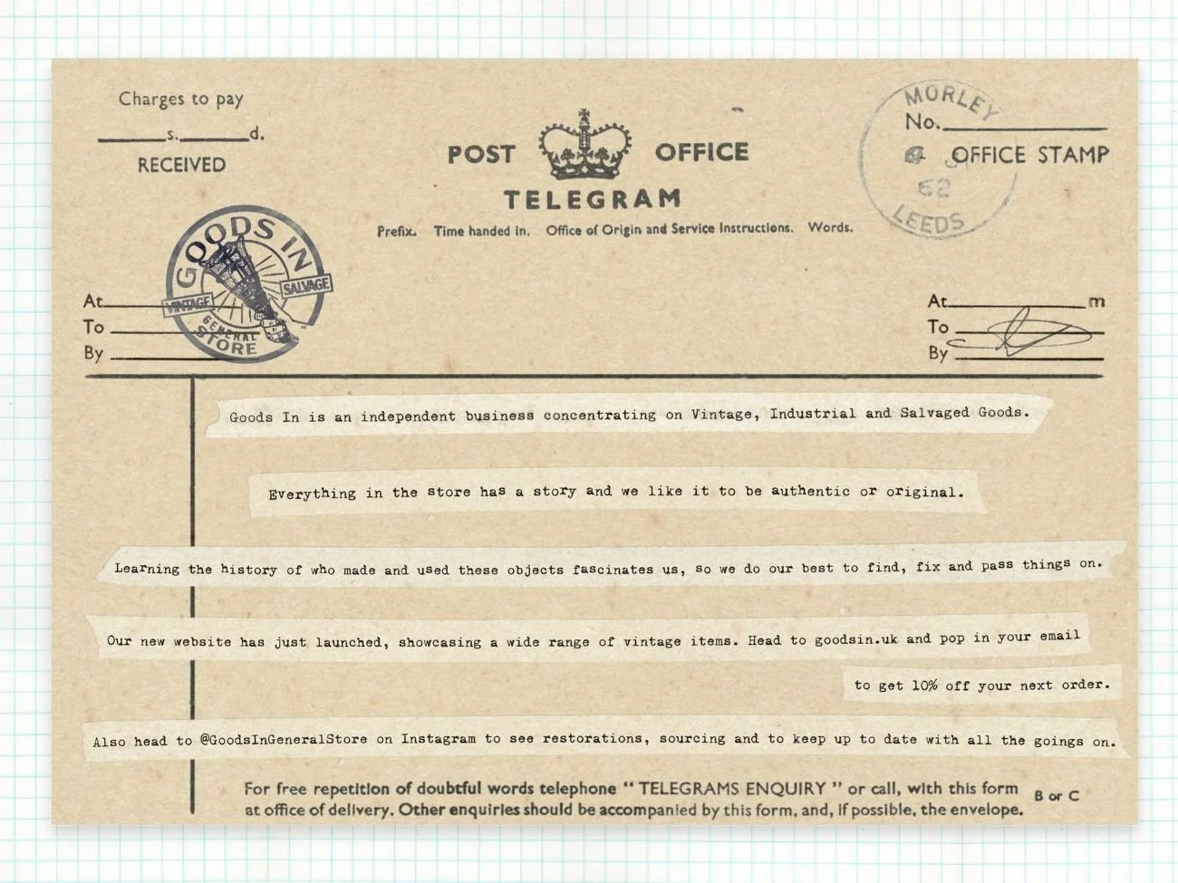 Goods In specialises in vintage, industrial and salvaged furniture, homeware and accessories. Based in Leeds, UK, they source authentic vintage goods with a unique history. The brief for this project was to create a series of flyer designs for use across multiple sales channels - Etsy, Website Sales, and Fairs/Markets.