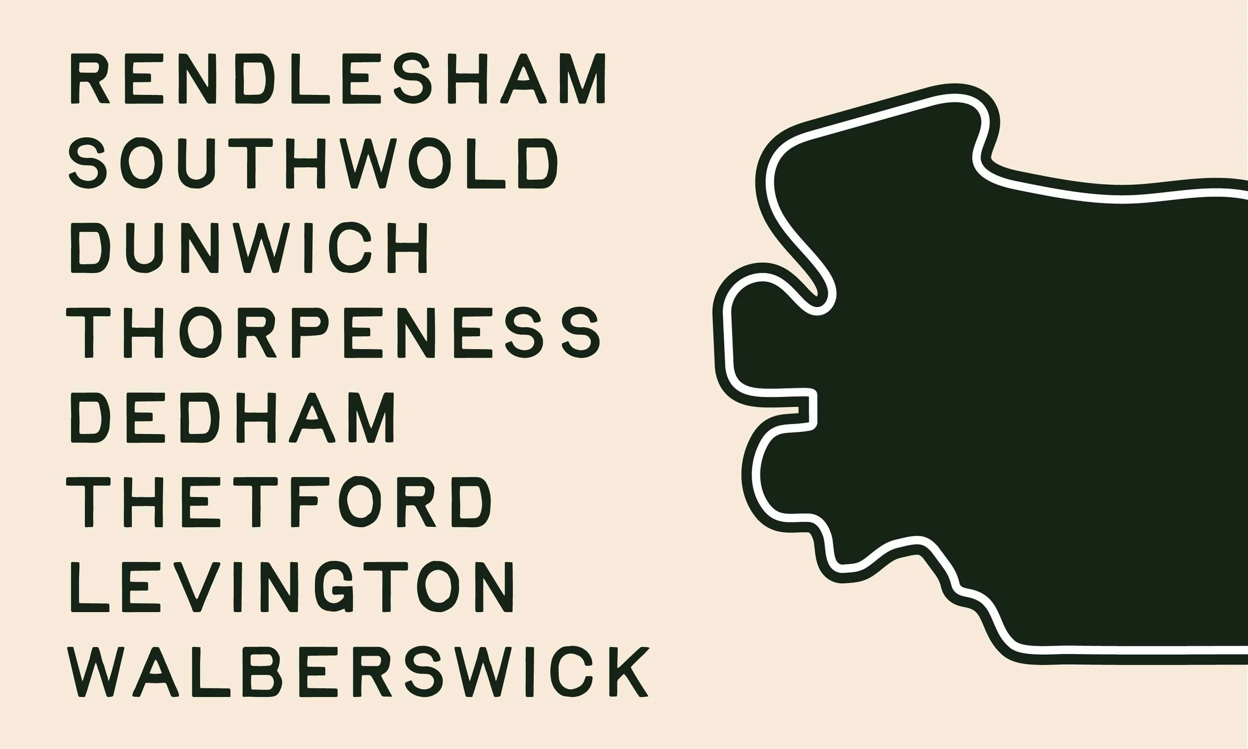 The colour palette was crafted to reflect the changing hues of Suffolk’s scenery throughout the seasons and across the county - rich, dark, earthy greens of a winter in Rendlesham Forest, a vibrant and fresh green of a blooming spring in Lavenham, the hazy, soft, pastel pink of a summer morning in Southwold, and an autumnal, warm orange, symbolic of the famous “Suffolk Sunset”.